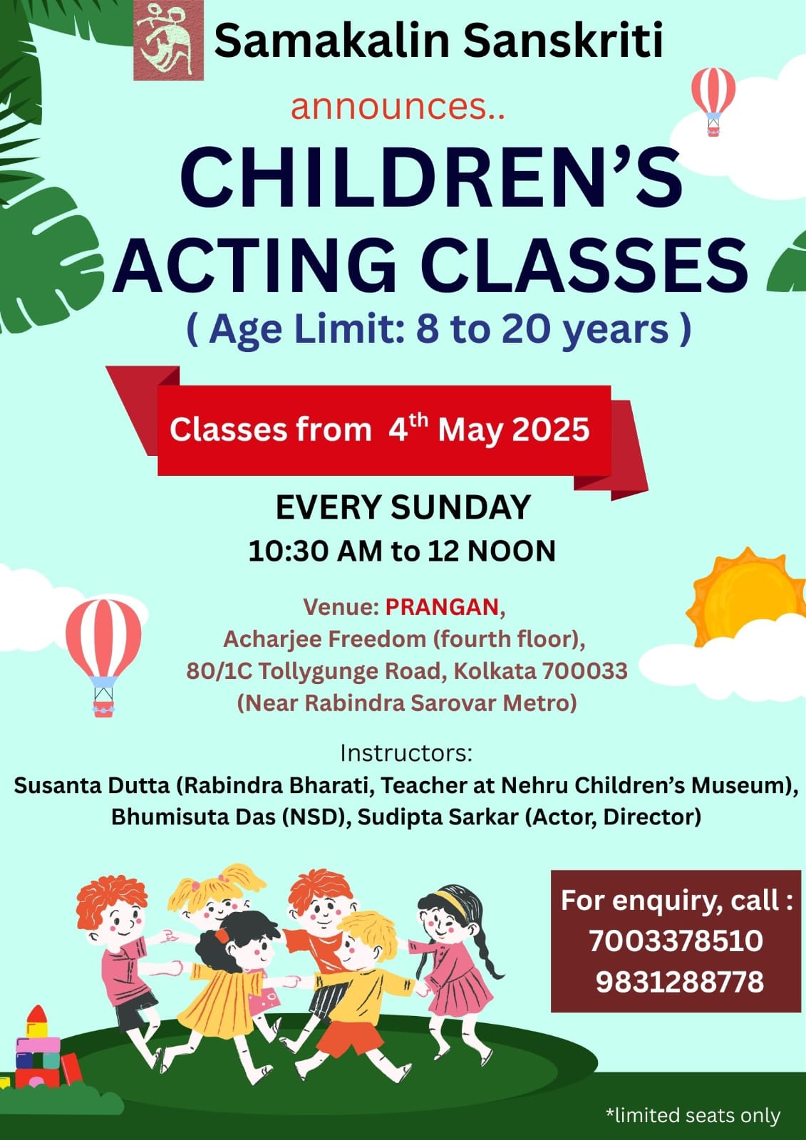 In 2025, Samakalin Sanskriti launched its Junior Acting Classes, a nurturing space designed for young and enthusiastic actors between the ages of 8 and 20. Conducted weekly, these sessions are guided by accomplished theatre professionals who mentor children in the art of performance while fostering essential life skills such as teamwork, leadership, and confidence.